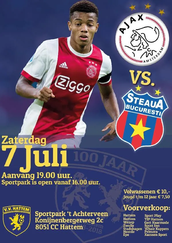 Op zaterdag 7 juli speelt Ajax als voorbereiding op de voorronde van de Champions League een oefenwedstrijd tegen Steaua Boekerest op sportpark ’t Achterveen bij vv Hattem. Hoog op het wensenlijstje van de 100-jarige vereniging stond om in dit jubileumjaar een mooie wedstrijd te organiseren. Hoe gelegen kwam het dat Ajax kwam informeren of zij bij vv Hattem een oefenwedstrijd tegen een internationale tegenstander mochten spelen!