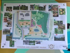 Bij aankomst in het park werd het vlekkenplan voor voedselpark Assenrade gepresenteerd: een afbeelding van het park waarin de schetsen te zien zijn van de plannen. Een enthousiaste vrijwilliger gaf uitleg. De stichting hoopt dat er een natuurlijk watertje komt waar waterdieren zoals salamanders, kikkers en libelles leven. Daarnaast is er ruimte ingericht voor een pluktuin, een vogelbosje, fruitbomen, ‘Gildenveld’ (gildeplanten die fruitbomen ondersteunen, zoals smeerwortel en Mediterrane kruiden), de ‘Notenberg’, een plek met notenbomen, en de ‘Warmteplek’ een stukje grond waar de zon het meest op schijnt.