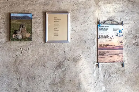 “Daarnaast heb ik in het voorportaal een poster, een gedicht over woorden en een in Schotland gemaakte foto opgehangen”, deelt de exposant mee. “Op de poster is een gedicht te lezen dat ik schreef na een bezoek aan Zeeland. De foto onder het gedicht heb ik eveneens in Zeeland gemaakt. Enkele kernwoorden in dit gedicht zijn: afscheid, verwaaien en verleden.”
