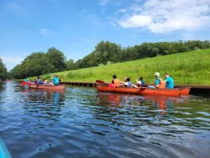 Nadat alle vossen gevangen waren, begaf de groep zich richting Vadesto. Hier konden we zo in de kano stappen en na een heerlijke tocht over het Apeldoorns kanaal en een ijsje bij terugkomst, bewoog de meute zich weer naar De Zandkreek.