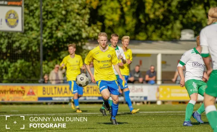 De grootste kans van de eerste helft was er voor Ruben Bouwhuis, maar zijn schot was te zacht om de doelman te verrassen. Veel duels waren er op het middenveld, de ploegen waren aan elkaar gewaagd.