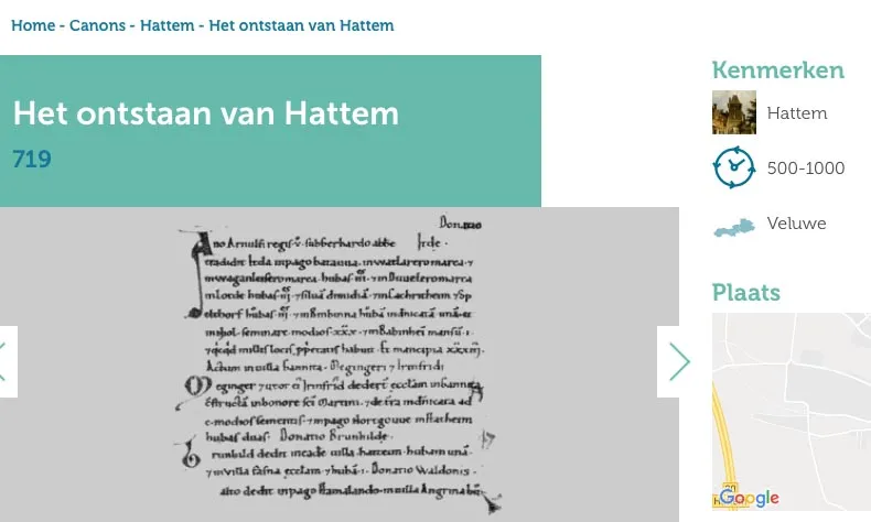 De Vereniging Heemkunde Hattem heeft voor de website mijngelderland.nl de canon van Hattem beschreven. Het hele verhaal over het ontstaan van Hattem en de ontwikkeling van de stad nadien is op deze website na te lezen.