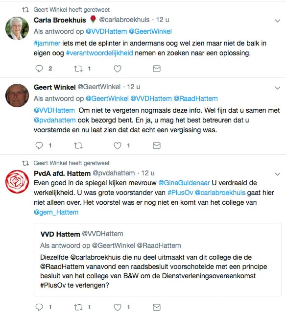 Daarmee is de twitter-discussie nog niet gesloten. De VVD Hattem laat blijken niet blij te zijn met de gang van zaken en publiceert een tweet waarin zij Wethouder Carla Broekhuis (PvdA) noemen: ‘Diezelfde Carla Broekhuis die nu deel uitmaakt van dit college die de Raad Hattem vanavond een raadsbesluit voorschotelde met een principebesluit van het college van B&W om de Dienstverleningsovereenkomst PlusOV te verlengen.
