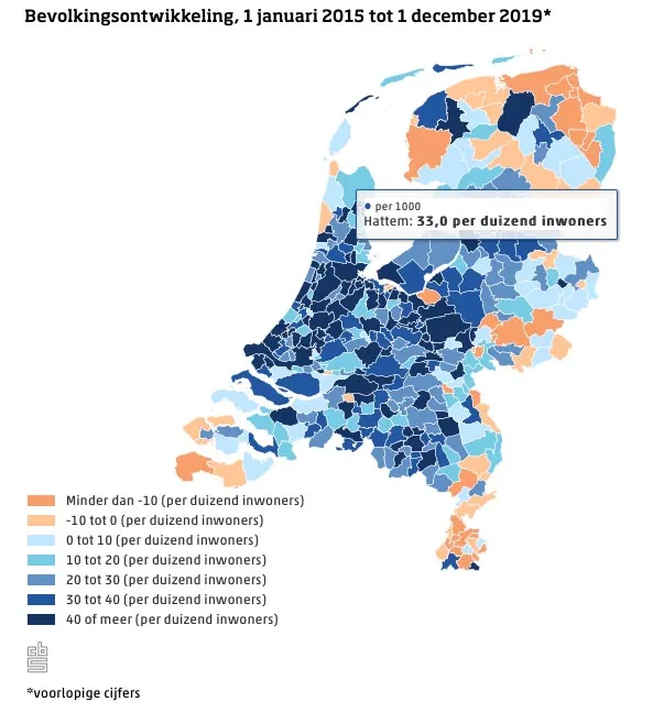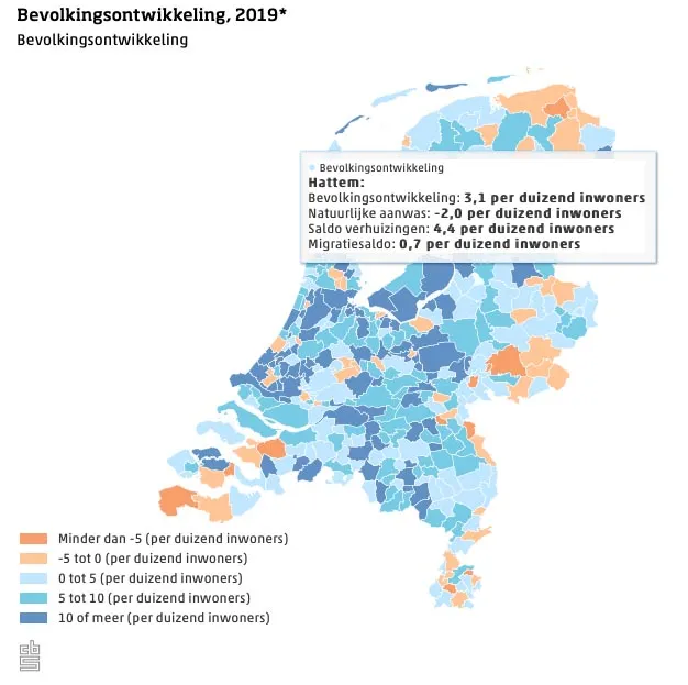 Volgens het CBS groeide in 2019 de bevolking in kleinere gemeenten rond de grote steden relatief gezien het sterkst, vooral door verhuizingen vanuit andere gemeenten. In Hattem is deze trend ook zichtbaar, want van de totale groei in Hattem is 4,4 inwoners op 1000 het gevolg van verhuizingen van mensen, zoals Zwollenaren, die gekozen hebben voor Hattem als nieuwe woonplaats.