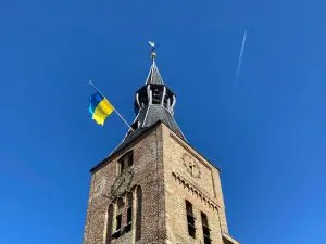 “Vandaag hebben we twee Oekraïense vlaggen uitgehangen als blijk van solidariteit. Op de voorgevel van ons Stadhuis en in de toren van de Grote Kerk.”