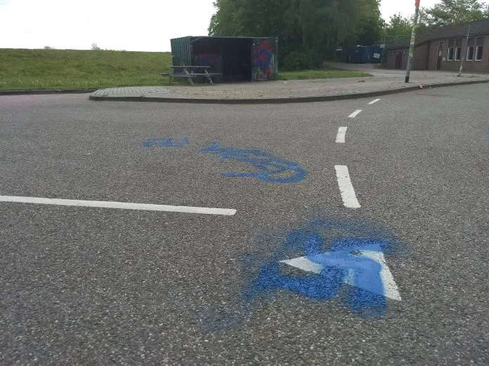 Op de kruising van de Burg. Moslaan – Hoopjeslaan is door onbekenden graffiti gespoten op de rijbaan. In de kleur blauw zijn verschillende hakenkruizen gespoten en het woord Wezep.