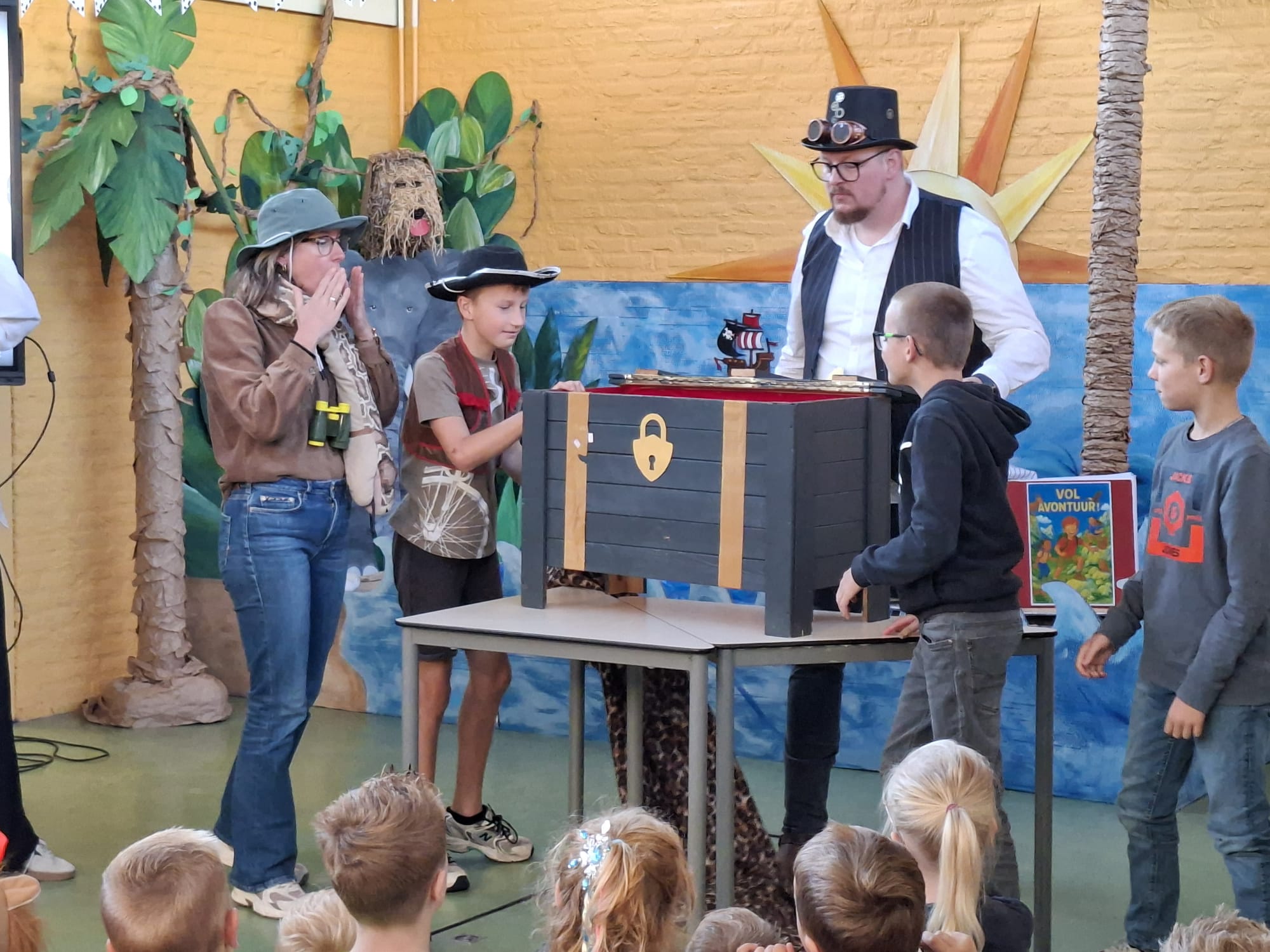 ‘Daarna hadden de juffen en meesters een heel toneelstuk voorbereid: het ging over een schat en die was verstopt. Een juf had een stuk papier in haar hand en moest een paar kinderen op lossen waar de schat lag! Toen we iets later de schat hadden gevonden, maakten we de kist open… daar zaten boeken in! Voor elke klas één! Wij kregen het boek De zomer die alles was.