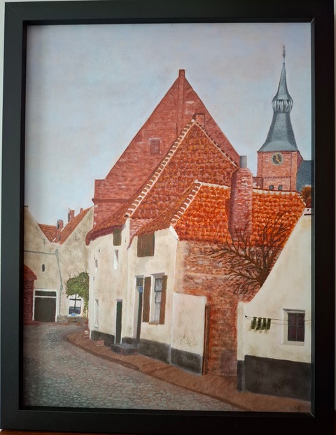 ‘In het verleden had ik van iemand een mapje met zwart/wit foto’s gekregen van oud Hattem. Daar heb ik vijf schilderijen van gemaakt, onder andere een van het Liefdeshuis. In het museum hangt een schilderij van het Liefdeshuis, gemaakt door Anton Pieck.