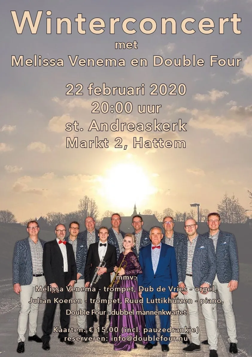 Het Hattemse mannenkwartet Double Four geeft een Winterconcert. Speciale gast bij dit concert is Melissa Venema (trompettiste uit Zaandam). Verder verlenen Dub de Vries (orgel), Ruud Luttikhuizen (piano) en Julian Koenen (leerling van Melissa) hun medewerking.