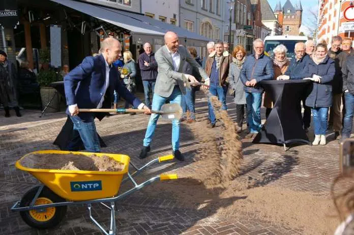 En dat wás het woensdagmiddag ook. Beschenen door een lekker zonnetje hebben wethouder Auke Schipper en de heer Alberti, directeur van NTP, de nieuw bestrate Markt officieel geopend. Zij deden dat door een flinke schep zand over de klinkers uit te strooien, onder het motto: zand erover. (tekst gaat verder na de video)