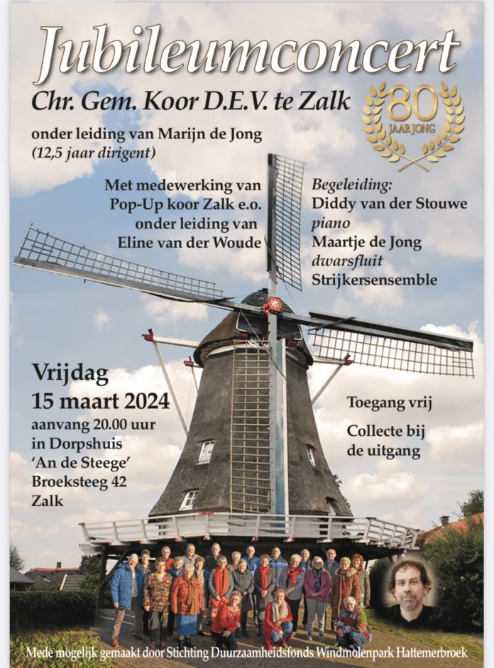 Het Chr. Gem. Koor D.E.V. uit Zalk geeft op vrijdag 15 maart een jubileumconcert. Op die dag bestaat het koor 80 jaar. De dirigent Marijn de Jong is dan 12,5 jaar verbonden aan het koor.