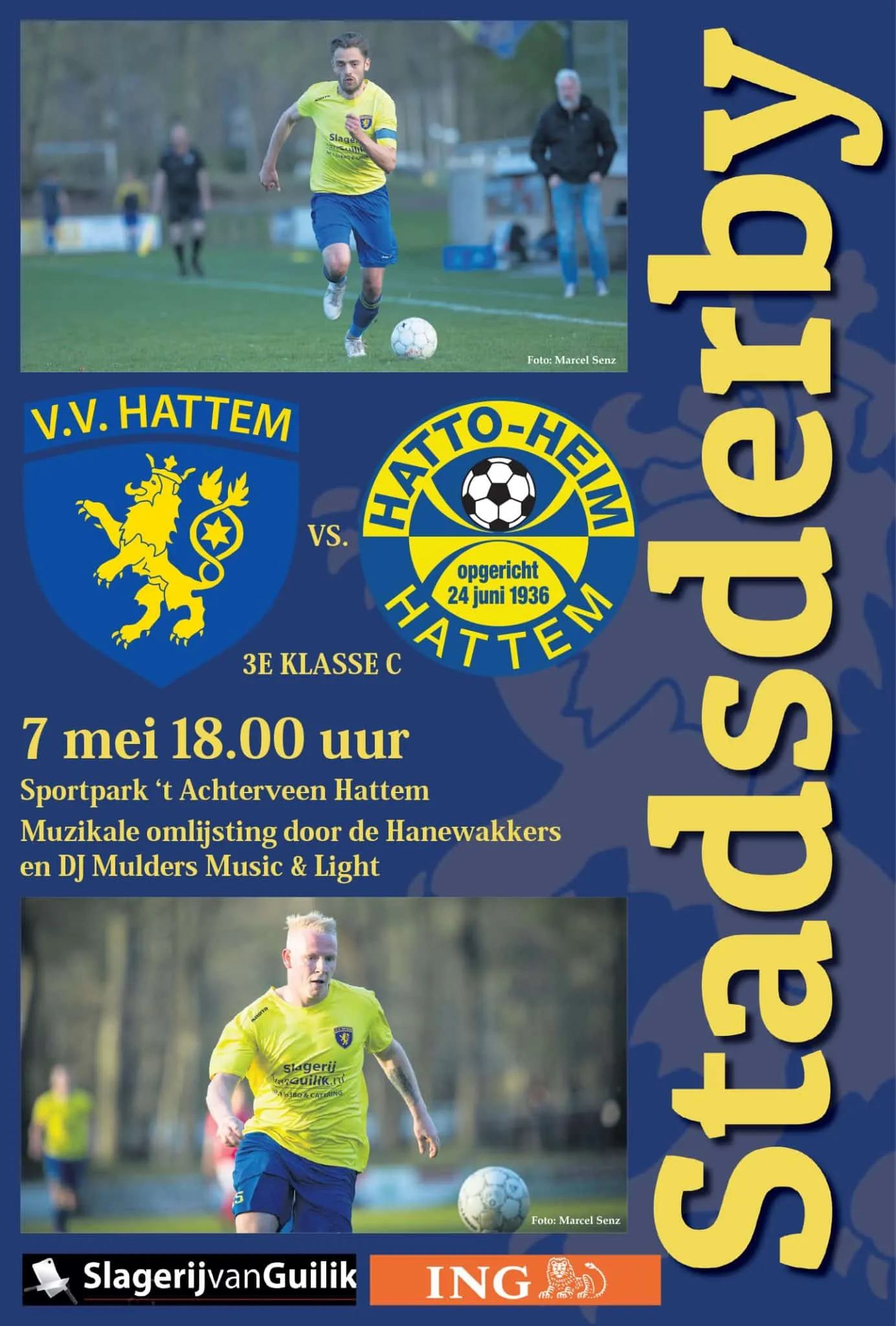 “Zaterdag zijn alle ingrediënten aanwezig voor een mooie spectaculaire wedstrijd. Het begint met de basis. Een mooi sfeervol sportpark, een boerenkapel, een drankje, de geur van hamburgers en een echte grasmat waar menig betaald voetbalclub jaloers op is”, vertelt Arjen Noorberger van v.v. Hattem.