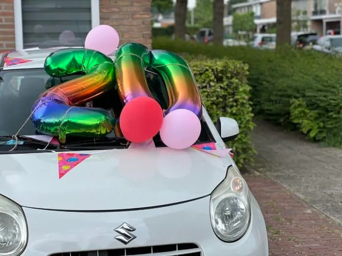 Onderweg naar een persmoment kwamen we 4 juni rond het middaguur deze auto tegen. Wilde de eigenaar de versierselen nog even laten zitten, blij met de verrassing, of was hij of zij nog niet wakker? Wij werden er in ieder geval vrolijk van.