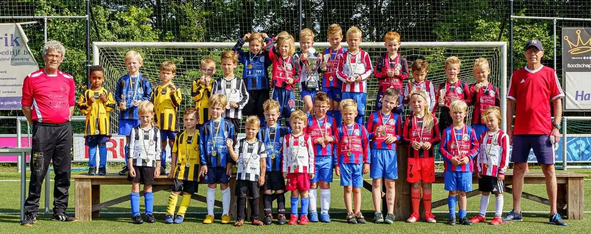 Iedere zaterdag speelden de ruim 25 mini’s hun ‘4 tegen 4 wedstrijdjes’ in de tenues van o.a. Barcelona, Juventus, Bayern München en AC Milan. Ook namen zij ieder 3 penalty’s. Wie hebben de meeste wedstrijdjes gewonnen en wie heeft de meeste penalty’s gescoord? Omdat iedereen elke week erg zijn best had gedaan, kregen eerst alle mini’s een mini-beker. Daarna werden de grote bekers uitgereikt.