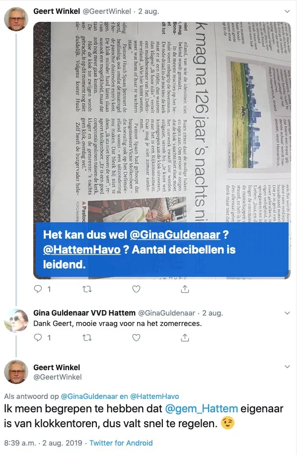 En daarna was het stil. Op Twitter. Tot Geert Winkel op 2 augustus een nieuwsbericht uit De Stentor op Twitter plaatste. Dit bericht gaat over het geluid van de klokken van de Bonaventurakerk in Woerden. Omdat één buurtbewoner niet kan slapen door het gebeier van de klokken van deze kerk en daarover heeft geklaagd, mag de klok niet meer luiden. (tekst gaat verder onder de foto)