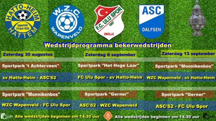 sv Hatto-Heim is in de KNVB Beker-poulefase ingedeeld samen met ASC’62 (Dalfsen) – WZC Wapenveld en FC Ulu Spor(Zwolle). Zaterdag 2 augustus zijn de wedstrijden gepubliceerd. Het toernooi om de districtsbeker start met een poulefase met drie groepswedstrijden in de weekenden van 30 augustus, 6 september en 13 september.