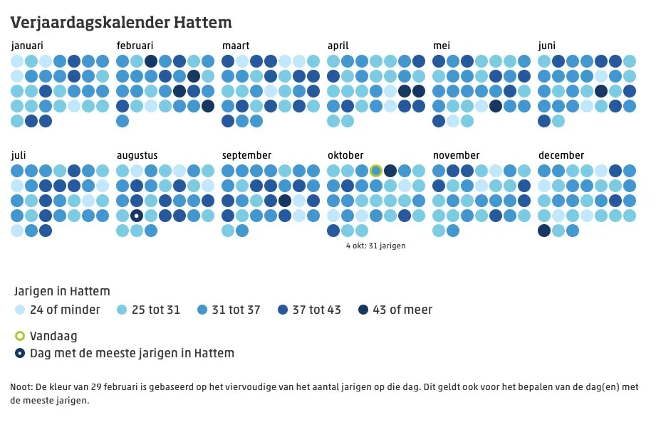 Hieruit valt te lezen dat vandaag, 4 oktober, 31 mensen in Hattem hun verjaardag vieren. Op 23 augustus zijn de meeste Hattemers tegelijk jarig en wel 49 mensen. Wil je weten hoeveel mensen in Hattem samen met jou hun verjaardag vieren? Kijk dan op de website van het CBS.