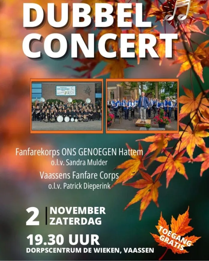 Op zaterdag 2 november treden Ons Genoegen en het Vaassens Fanfare Corps samen op in het Dorpscentrum De Wieken in Vaasen. De toegang is gratis. Het concert begint om 19.30 uur.