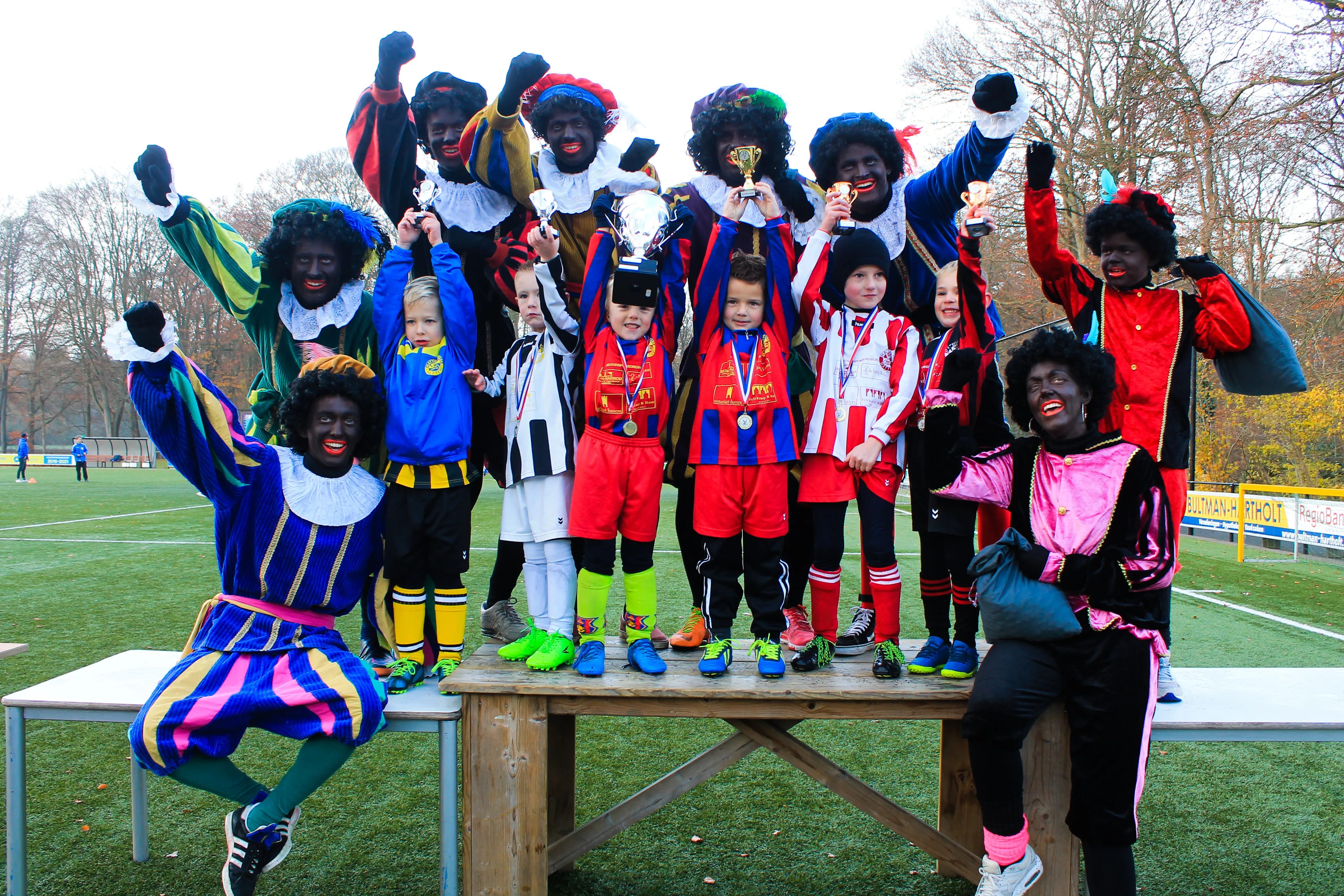 Zaterdag speelden de mini’s van s.v. Hatto-Heim dit jaar voor de laatste keer op het hoofdveld van sportpark ‘t Achterveen. Het beloofde een speciale dag te worden voor de jonge talentjes. Net als voorgaande jaren had Sinterklaas al aangekondigd dat een aantal zwarte pieten zou gaan meevoetballen.