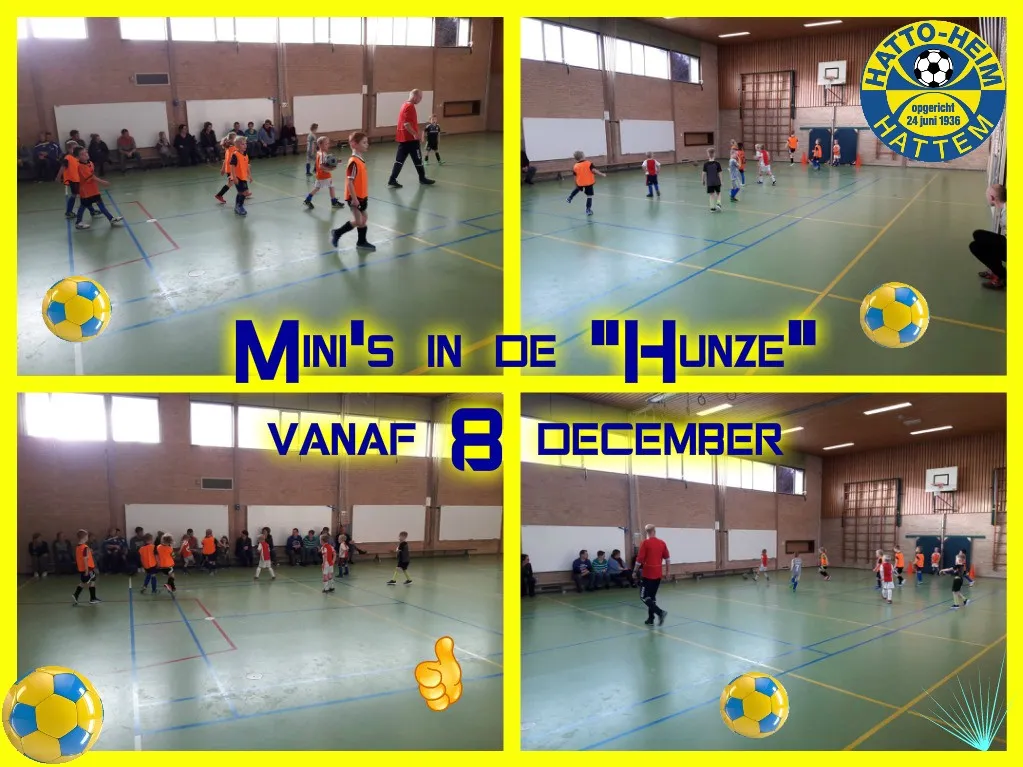 Vanaf zaterdag 8 december gaan de voetballertjes het voetballen voortzetten in de zaal in aan de Hunze. Mocht jouw zoon of dochter ook bij de mini’s van s.v. Hatto-Heim willen voetballen dan kun je contact opnemen met John Eikelboom ( tel. 06 – 37477128) of even kijken op de website www.svhattoheim.nl.