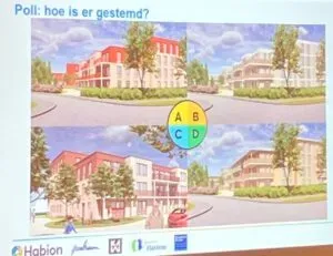 Op de website https://www.habion.nl/projecten/de-bongerd-hattem/ zijn ontwerpsferen geplaatst. Er kon gestemd worden middels een poll welke sfeer het meest aanspreekt. Er is tot nu toe 120 x gestemd. Voor A en B is nauwelijks gestemd. Plaatje D is met 65 stemmen het meest favoriet. Op de thema tafels achter in de zaal lagen verschillende materiaal soorten die in de ontwerpen te zien zijn.