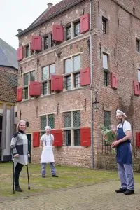 Burgemeester Sanderse is trots op de publieksprijs die het Bakkerijmuseum heeft gekregen en gaf vanmiddag persoonlijk een mooie bos bloemen aan Voskuil en zijn medewerkers.