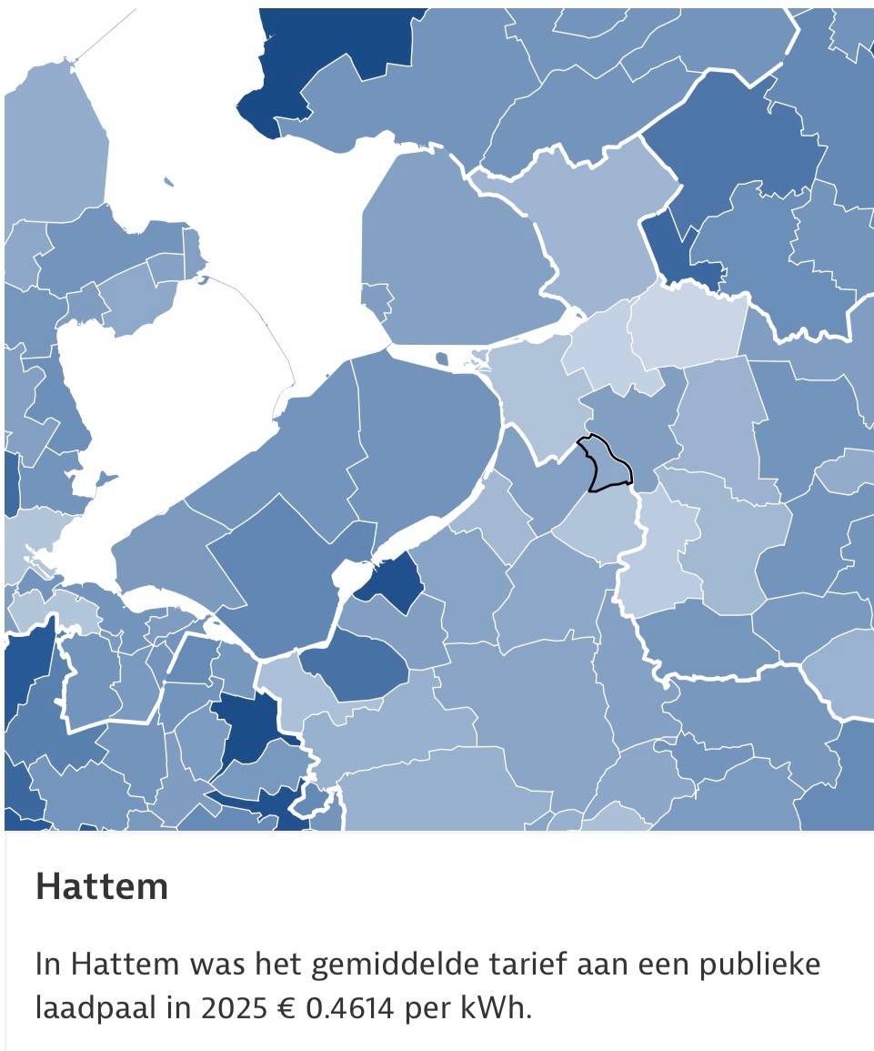 ANWB Laadpas analyseerde bijna zes miljoen laadsessies in 2025 bij openbare (langzame) laadpalen. Landelijk betaalden gebruikers gemiddeld 48 cent per kWh, maar per gemeente lopen de tarieven sterk uiteen: van ongeveer 33 cent in Nederweert tot bijna 70 cent in Oegstgeest — meer dan een verdubbeling. Het gemiddelde tarief in Hattem is 46 cent.