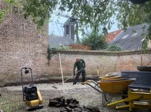 Op de binnenplaats was er na 37 jaar een weelderige plantengroei ontstaan. Grote struiken en twee grote bomen. De grootste struiken en 1 boom zijn inmiddels verwijderd en de ontstane ruimte van ruim 40 m2 is met hergebruikte waaltjes verhard. Op 5 plaatsen langs de muur zijn nu alvast grote tegels geplaatst waar sokkels op komen te staan. Om het groen te compenseren worden er leiperen langs de muren geplaatst.