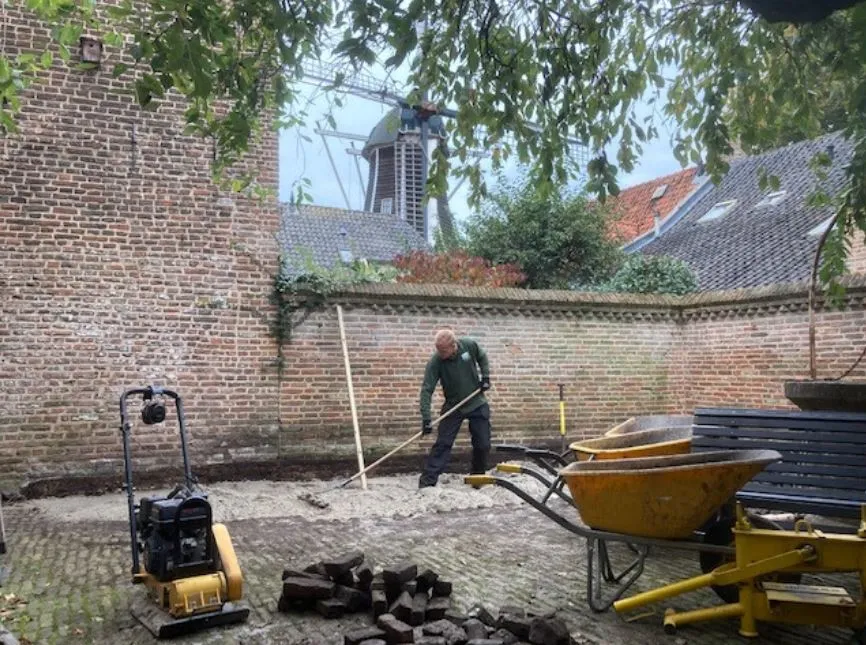 Op de binnenplaats was er na 37 jaar een weelderige plantengroei ontstaan. Grote struiken en twee grote bomen. De grootste struiken en 1 boom zijn inmiddels verwijderd en de ontstane ruimte van ruim 40 m2 is met hergebruikte waaltjes verhard. Op 5 plaatsen langs de muur zijn nu alvast grote tegels geplaatst waar sokkels op komen te staan. Om het groen te compenseren worden er leiperen langs de muren geplaatst.