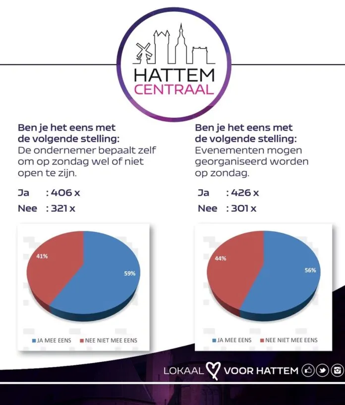 De enquête onder 1500 Hattemers, georganiseerd door HattemCentraal, onthult interessante inzichten over zondagopenstelling en zondagse evenementen. Van de respondenten vindt 59% (406 Hattemers) dat ondernemers zelf de keuze moeten hebben om op zondag open te zijn. Voor zondagse evenementen is 56% (426 Hattemers) enthousiast.