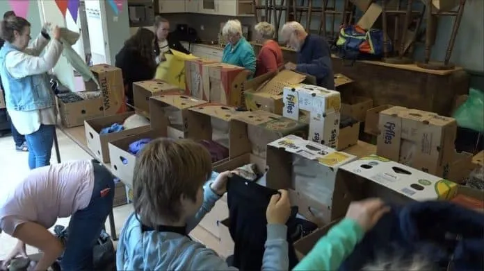 In een kleine ruimte bij de kerk staat een groepje vrijwilligers driftig kleding te sorteren. ‘Man, vrouw, kind’ roepen de mensen tegen elkaar. De kleding vliegt over tafel. Kleding voor vrouwen naar de ene kant van de tafel en die voor de mannen naar de andere kant. De kleding voor de kinderen gaat naar het eind van de tafel. Stapels met bananendozen worden er gevuld. De goederen worden bij een tafel voor de kerk aangenomen en naar binnen doorgesluisd.