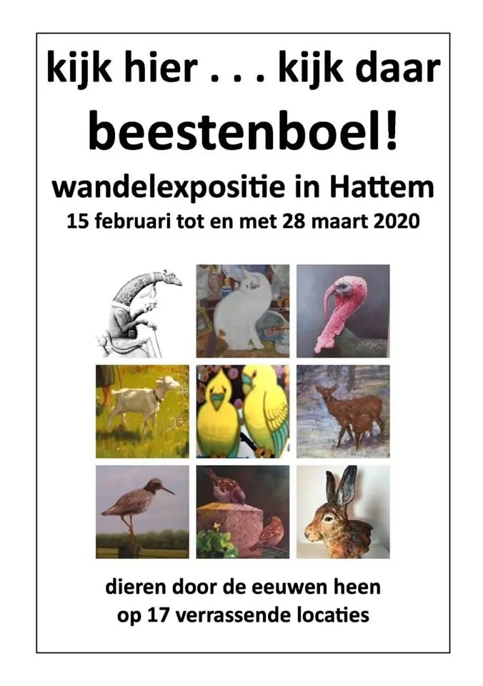 Van 15 februari tot 28 maart kom je in de Hattemse musea, galeries en winkels schilderijen, beelden en kunst tegen. Dit jaar is het thema “Beestenboel, dieren door de eeuwen heen’. Dieren dus, die in verschillende verrassende verschijningsvormen worden getoond.