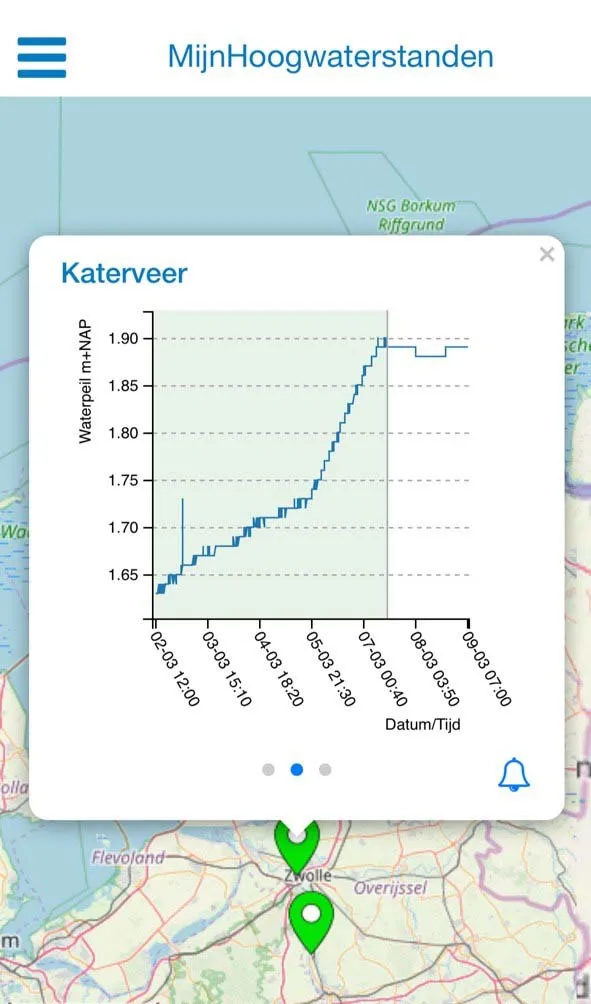 De waterstand van de IJssel bij Zwolle (Katerveer) was vandaag om 16.30 uur 191.0 cm boven NAP, verwachting voor morgen is 188.0 cm