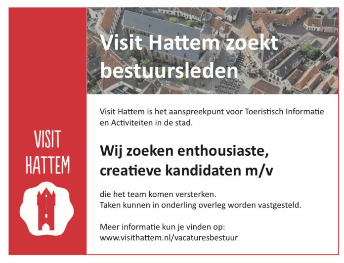 Het bestuur, dat geheel uit vrijwilligers bestaat, zoekt niet alleen kandidaten om het bestuur te versterken maar ook om de huidige bestuursleden te kunnen opvolgen. ‘Wij zoeken enthousiaste, creatieve kandidaten, waarvan taken in overleg kunnen worden vastgesteld. Kandidaten die een project kunnen aansturen en daar ook tijd voor hebben zijn meer dan welkom’, aldus Ger de Jong, voorzitter Visit Hattem. ‘Visit Hattem is een vrijwilligersorganisatie, waarin je snel thuis voelt. Onze mensen hebben wat voor elkaar over en voelen zich verbonden met hun “Visit Hattem-familie”. Hattem en zijn historische waarden, is niet alleen een prachtige en attractieve toeristische Hanzestad maar ook een stad waarin het fijn is om te wonen en daar willen wij ons vol voor inzetten.’