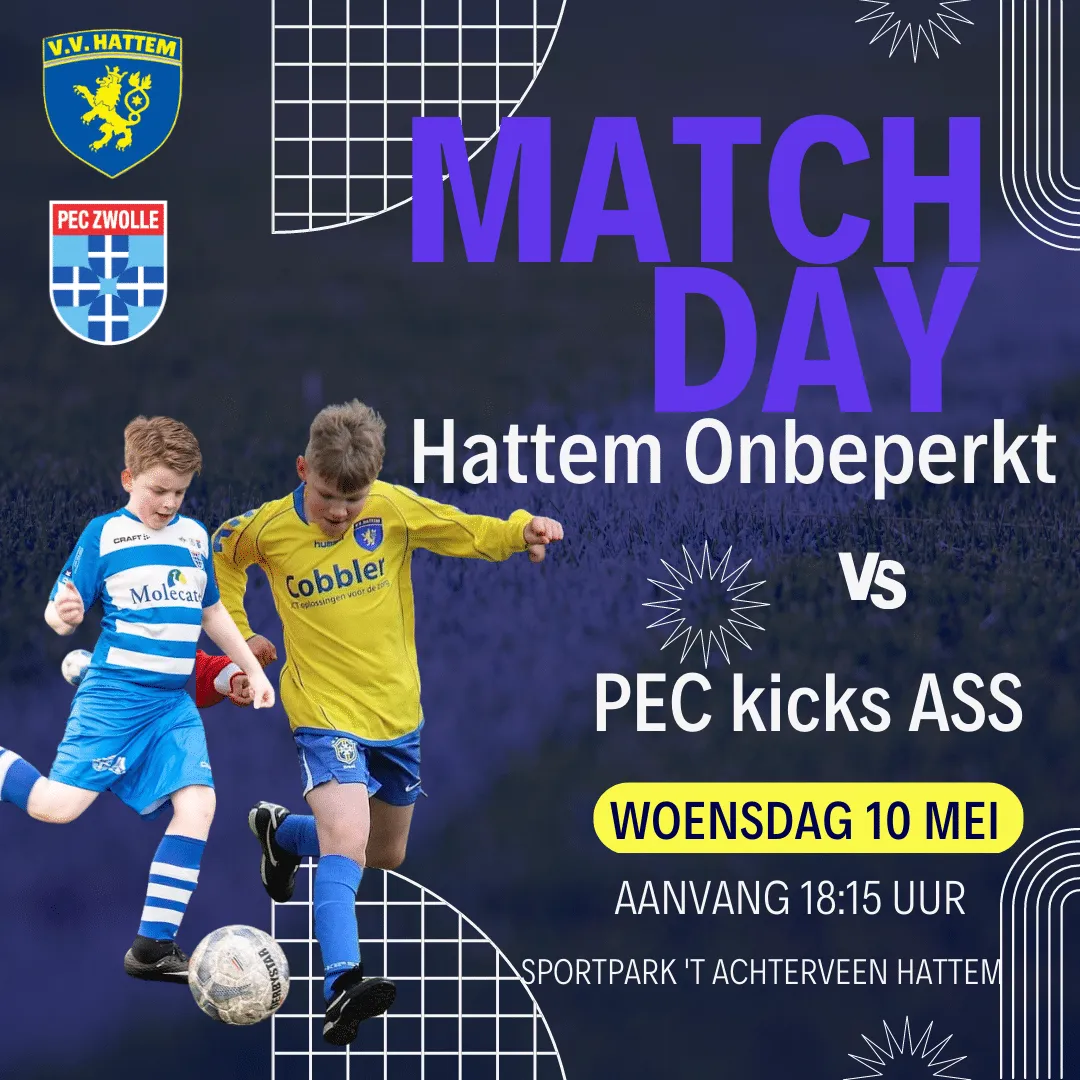 Hattem Onbeperkt is het project voor kinderen met een autisme spectrum stoornis. Deze kinderen hebben behoefte aan structuur en duidelijkheid in hun omgeving, wat in de reguliere voetbalwereld niet altijd vanzelfsprekend is. Doordat ze op een duidelijke en heldere wijze tegemoet getreden, zorgt v.v. Hattem met Hattem Onbeperkt er al meer dan 10 jaar voor dat deze kinderen toch kunnen voetballen. Onder leiding van deskundige en gedreven trainers vinden er elke woensdag, van 18.00 tot 19.00 trainingen plaats waarbij deelnemers niet alleen leren voetballen, maar ook contact maken met leeftijdsgenoten en leren samenwerken met vaste afspraken. De wedstrijd op 10 mei is dan ook een mooie kans om het enthousiasme en de inzet van deze bijzondere groep voetballers te aanschouwen. Ook aanwezig is dhr. Brunnekreef van de Zwaluwenactie, die zich inzet en ondersteuning biedt aan voetbal voor jeugd met een beperking.