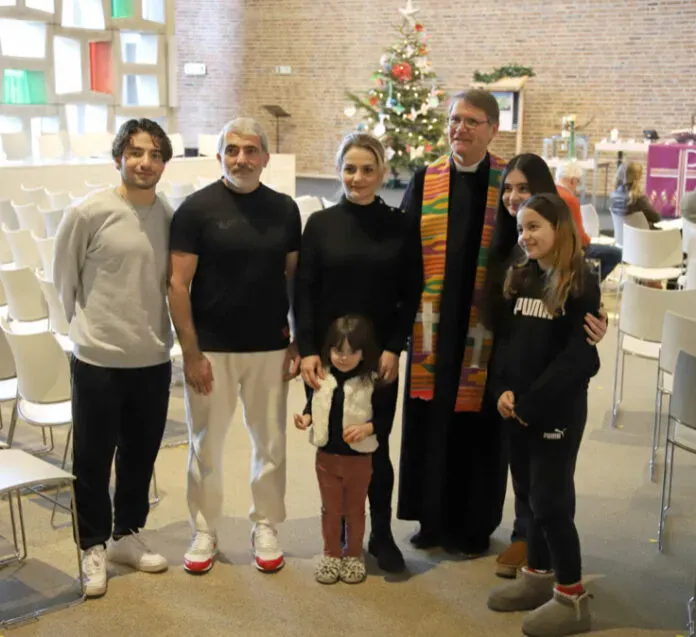 foto: de familie Babayants verblijft tijdelijk in in de Open Hof in Kampen. Op deze foto staat het gezin met de predikant van de Open Hof, Kasper Jager. (c) Kerkasiel Kampen