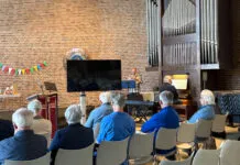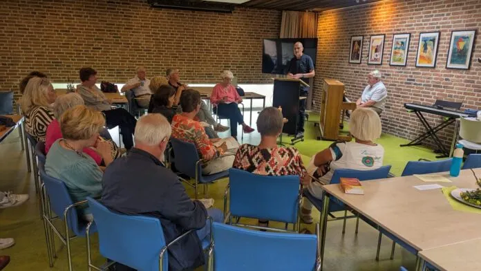 ‘Hans Lambrechts uit Hattem, neemt de deelnemers mee in het lied ‘De Geest van God waait als een wind’, lied 691. De wind, de duif, de gans, een vurige vlam, vele metaforen zijn er voor de Heilige Geest en we ervaren het in voor- en tegenspoed. Het gaf genoeg gespreksstof bij het beantwoorden van een aantal vragen.’