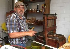 Imker Paul Docter gaat zaterdag 14 september een historische Trumf gebruiken bij het slingeren van heidehoning. Het is één van de activiteiten op Vrieze’s Erfgoed tijdens de Open Monumentendag dat deze dag ook het zomerseizoen gaat afsluiten.