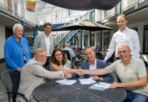 In de Hof van Blom werden de handtekeningen gezet door v.l.n.r. Wim Gerritsen (PbH), Jolanda van Loon (Triada) Frank Kodden (Vereen) en Jan Lassche (PbH).
