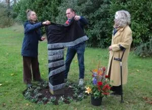 Lia Harmsen, Beeldhouwersgilde, en Erik van Mierlo, technisch manager van de gemeente Hattem, onthulden het monument.