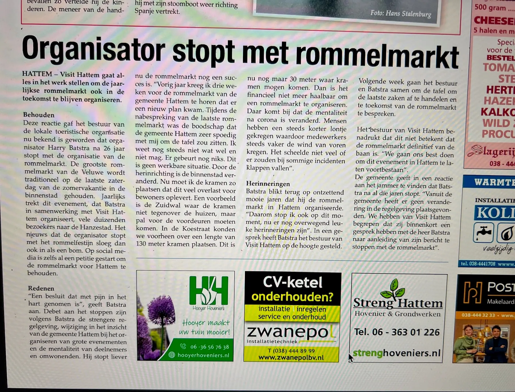 Hattemers schrijven op social media dat ze gaan missen. Zo schrijft een mevrouw: “Ons mooie Hattem heeft in de zomermaanden weinig activiteiten cq festiviteiten en dan moeten we een van onze grote activiteiten ook nog laten verdwijnen. Hierdoor missen horeca en ondernemers ook inkomsten. Wat we gaan missen is gezelligheid op deze dag in Hattem, de duizenden mensen die hiervoor komen. Het is de grootste rommelmarkt van de Veluwe, waardoor we ook naamsbekendheid krijgen, wat goed is voor het toerisme.” Herkenbaar?
