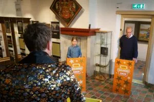 In de ‘grootouder-kleinkind quiz’ ontpopten vrijwilliger Duco Schotborgh en zijn kleinkind Koen zich bij quizmaster Jochem van Gelder als enthousiaste deelnemers.