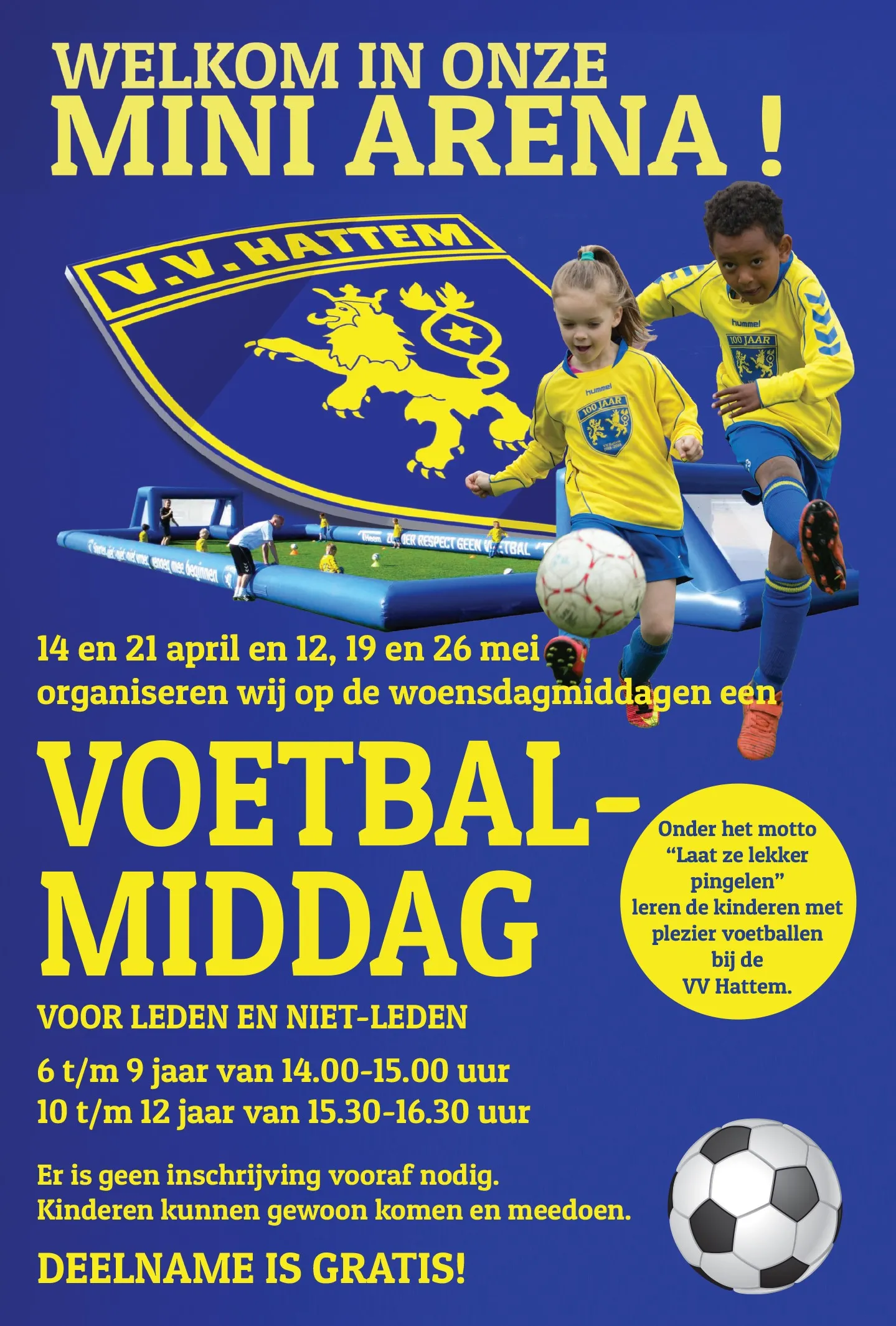 Aan deze Open Voetbalmiddagen kan iedereen meedoen, je hoeft niet op voetbal te zitten of lid te zijn van vv Hattem.