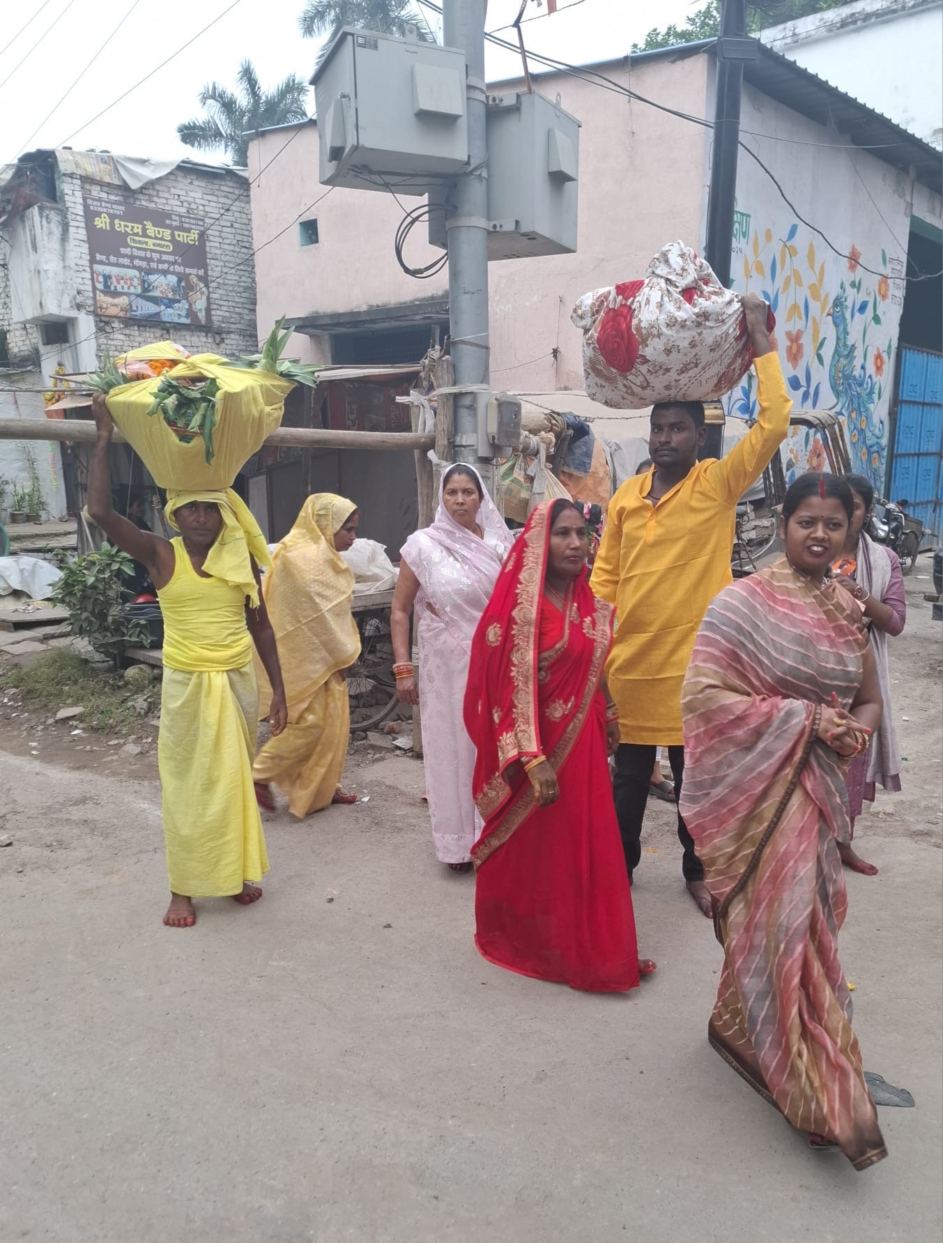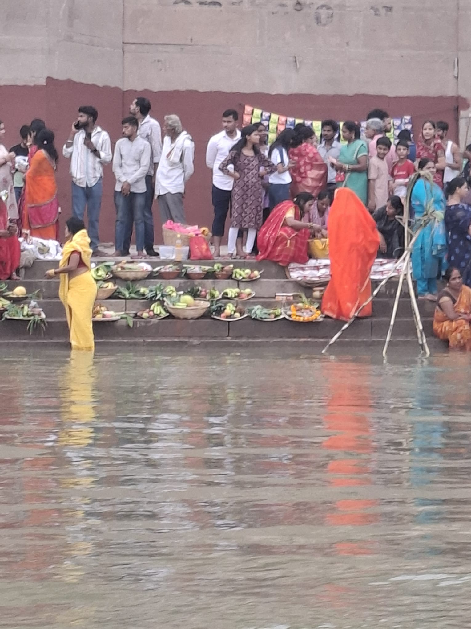 Op mijn laatste dag wordt er Chhath Puja gevierd. Tijdens het vierdaagse Chhath-festival hebben duizenden gelovigen zich verzameld aan de ghats van de Ganges in Varanasi om de ondergaande zon te eren. Vrouwen, gekleed in traditionele kleding en vastend, brachten offers in bamboe manden gevuld met fruit, zelfgemaakte lekkernijen zoals thekua, malpua, laddus, en suikerriet. Het vasten duurt tot het einde van het ritueel, tot de zon weer is opgekomen.