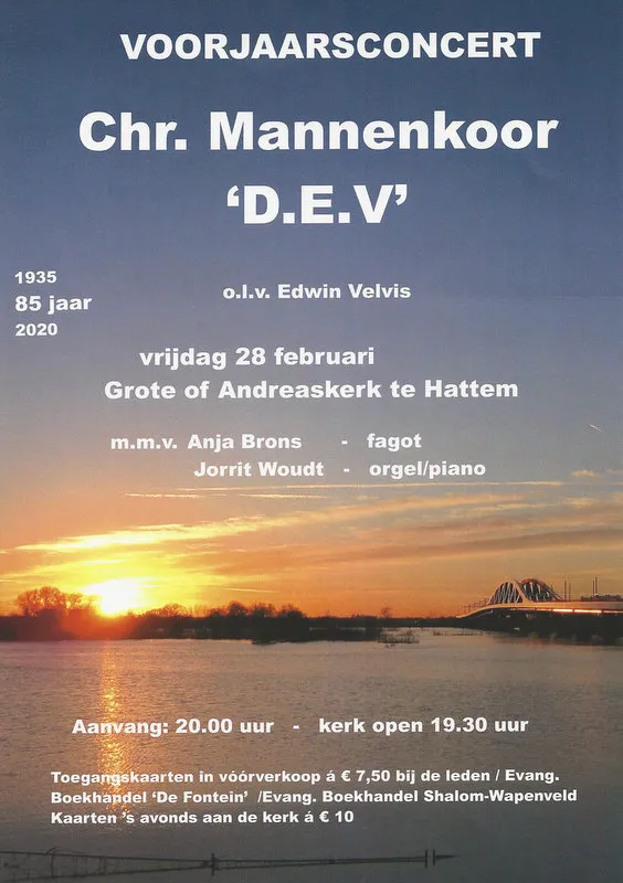 Het voorjaarsconcert van ‘D.E.V.’ o.l.v. Edwin Velvis wordt gegeven in de Grote- of Andreaskerk op vrijdag 28 februari. Het concert begint om 20.00 uur, de kerk is open om 19.30 uur. Toegangskaarten in de voorverkoop bij de leden en Evangelisch Boekwinkel “De Fontein” kosten € 7.50 p.p. Kaarten ’s avonds aan de kerk kosten € 10,=