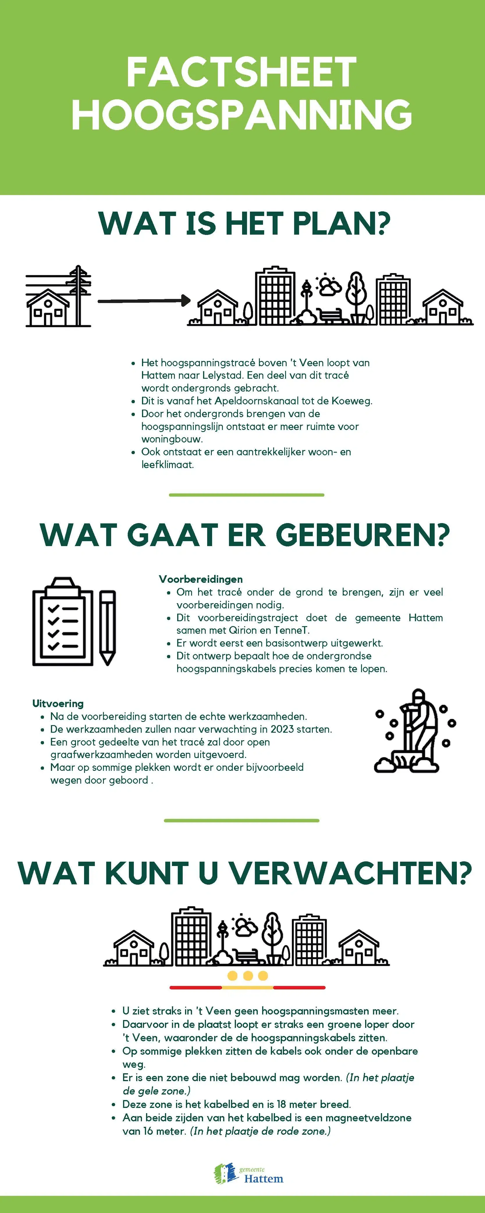 Wethouder Schipper is blij:  “Met het ondergronds brengen van de hoogspanningsverbinding komt een lang gekoesterde wens van de gemeente uit. Op deze manier wordt het leefklimaat in ‘t Veen sterk verbeterd. Uiteindelijk komt er circa 6,5 hectare meer ruimte beschikbaar voor woningbouw, dit is broodnodig voor onze woningbouwopgave in Hattem.”