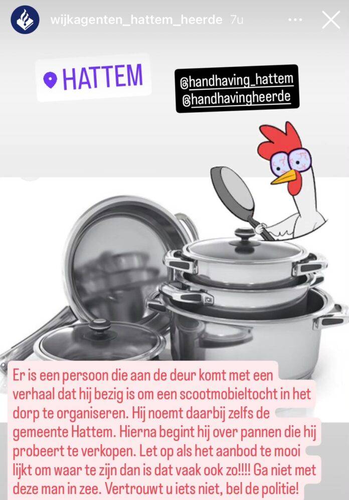 Deze man, ongeveer 45 jaar en Nederlands sprekend, heeft een grijze map bij zich met foto’s van ouderen op een scootmobiel. Hij rijdt in een grijze Peugeot met kenteken beginnend met V 23. Het kan ook zijn dat hij ook een dure pannenset wil verkopen. De politie weet dat deze man het probeert.