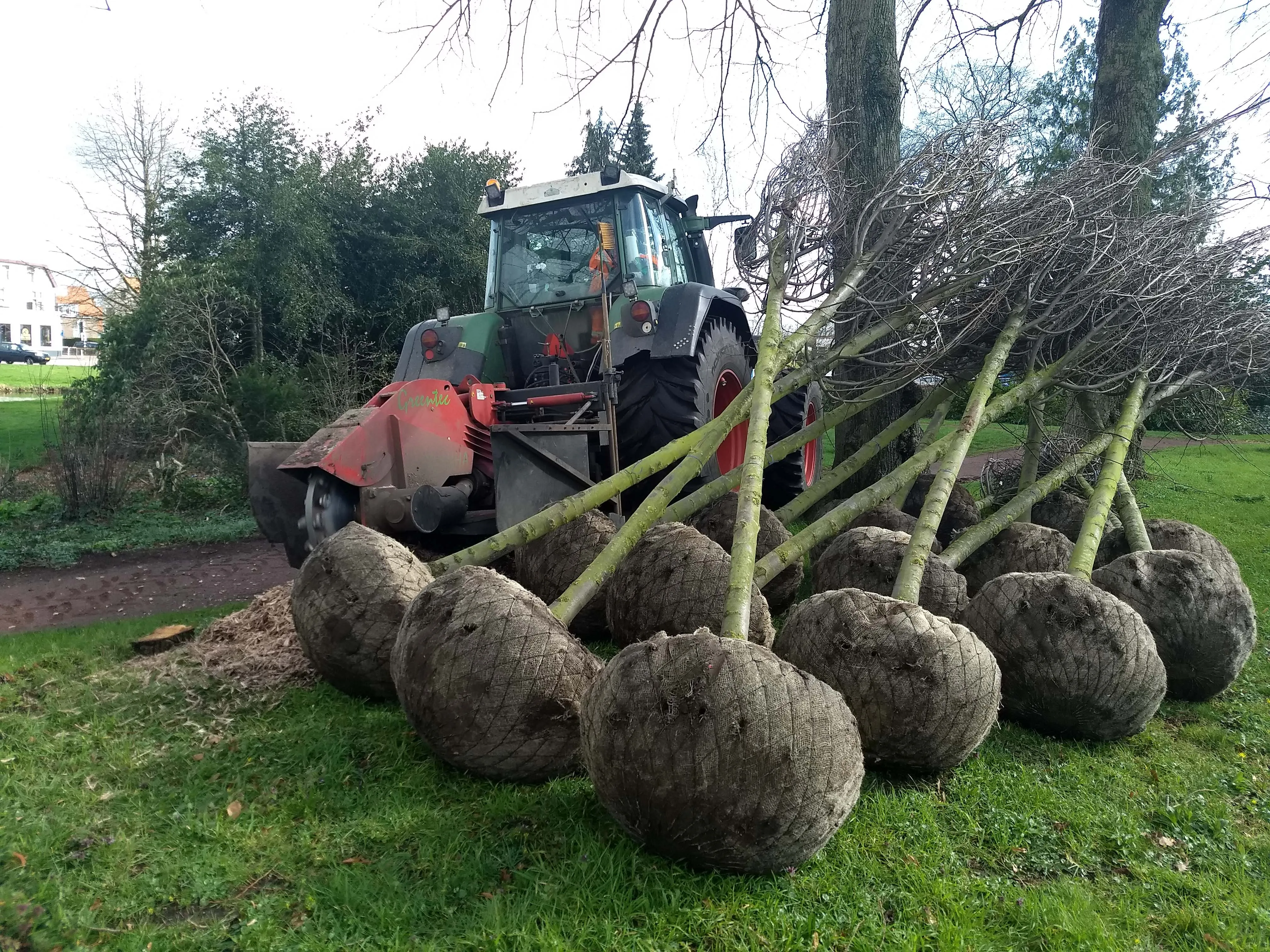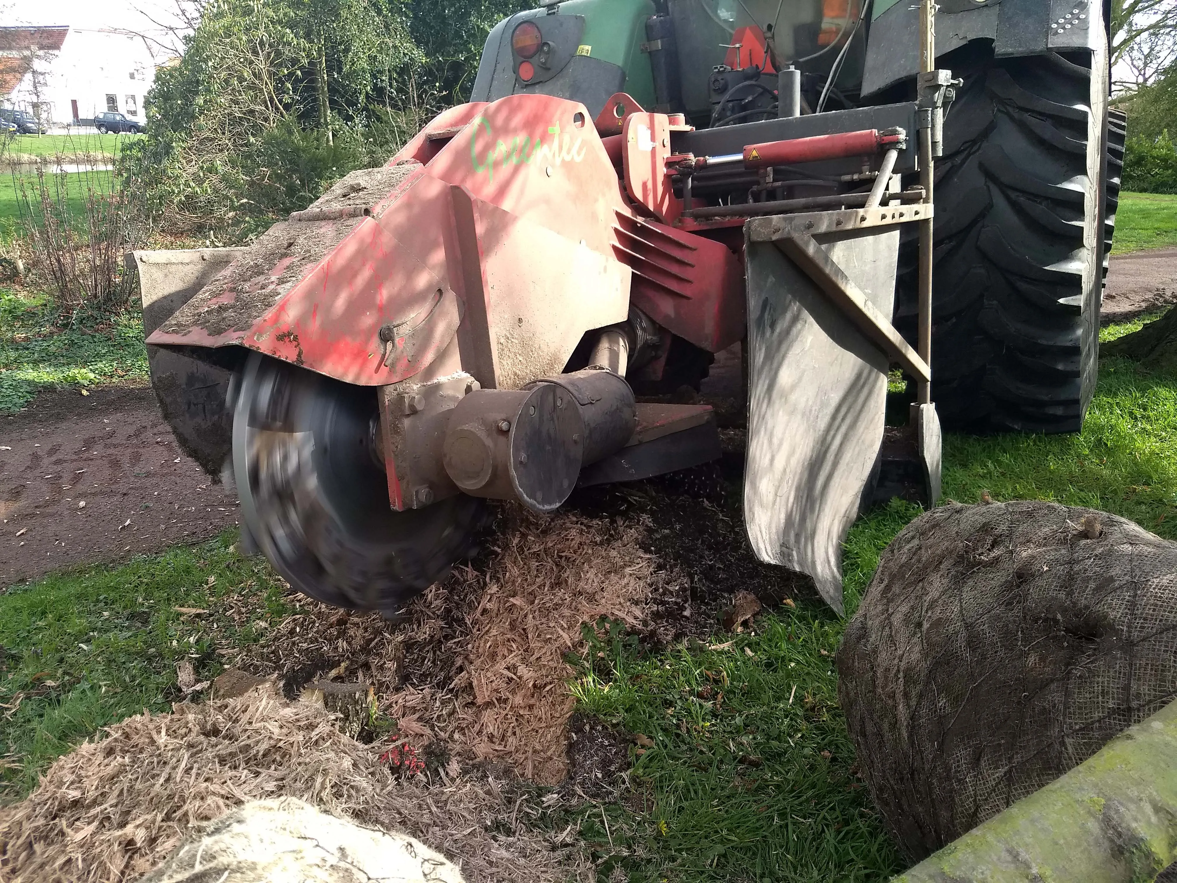 De bomen, die al een behoorlijke hoogte hebben, liggen klaar en vandaag is men bezig om de stobben van de oude bomen uit te frezen.