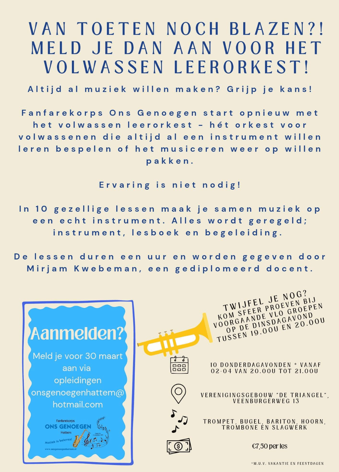 Ons Genoegen start opnieuw met een leerorkest voor volwassenen die altijd al een instrument willen leren bespelen of het weer willen oppakken. Het gaat om het bespelen van trompet, bugel, bariton, hoorn, trombone en slagwerk. Instrument en lesboek worden geregeld.