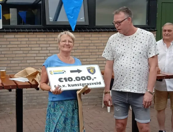 Ze mocht een cheque in ontvangst nemen voor een bijdrage van 10.000 euro van de Vriendenkring voor de aanleg deze zomer van de nieuwe toplaag van het kunstgrasveld. Blij verrast bedankte ze het bestuur van de Vriendenkring voor deze bijdrage en benoemde de steun die de vereniging al vanaf de oprichting van de supportersvereniging krijgt bij grote en kleine investeringen die ten goede komen aan de leden van de voetbalvereniging.